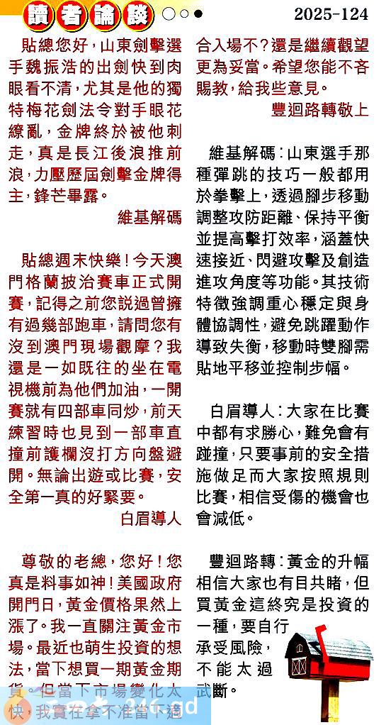 第一二四期讀者論談 1.貼總您好,山東劍擊選手魏振浩的出劍快到肉眼看不清,尤其是他的獨特梅花劍法令對手眼花繚亂,金牌終於被他刺走,真是長江後浪推前浪,力壓歷屆劍擊金牌得主,鋒芒畢露。維基解碼 〖維基解碼〗:山東選手那種彈跳的技巧一般都用於拳擊上,透過腳步移動調整攻防距離、保持平衡並提高擊打效率,涵蓋快速接近、閃避攻擊及創造進攻角度等功能。其技術特徵強調重心穩定與身體協調性,避免跳躍動作導致失衡,移動時雙腳需貼地平移並控制步幅。 2.貼總週末快樂!今天澳門格蘭披治赛車正式開賽,記得之前您說過曾擁有過幾部跑車,請問您有沒到澳門現場觀摩?我還是一如既往的坐在電視機前為他們加油,一開賽就有四部車同炒,前天練習時也見到一部車直撞前護欄沒打方向盤避開。無論出遊或比賽,安全第一真的好緊要。白眉導人 〖白眉導人〗:大家在比賽中都有求勝心,難免會有碰撞,只要事前的安全措施做足而大家按照規則比賽,相信受傷的機會也會减低。 3.尊敬的老總,您好!您真是料事如神!美國政府開門日,黃金價格果然上漲了。我一直關注黃金市場。最近也萌生投資的想法,當下想買一期黃金期貨。但當下市場變化太快,我實在拿不准當下適合入場不?還是繼續觀望更為妥當。希望您能不吝賜教,給我些意見。豐迴路轉敬上 〖豐迴路轉〗:黃金的升幅相信大家也有目共睹,但買黃金這終究是投資的一種,要自行承受風險,不能太過武斷。
