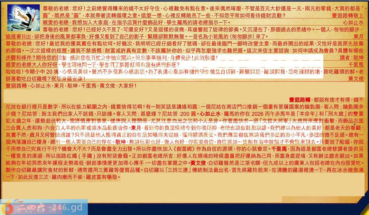 〖千里馬〗:因為這是創富老總替讀者提供另一種意見的渠道,所以指路紅繩(手繩)沒有附送會籍。正如創富老總所言:好像人在順境的時候盡量把好運納為己用,而當身處逆境,又有辦法趨吉避凶。如果能夠在年初洞悉來年運程走勢高低,辦起事情便更加得心應手,一切盡在掌握之中。