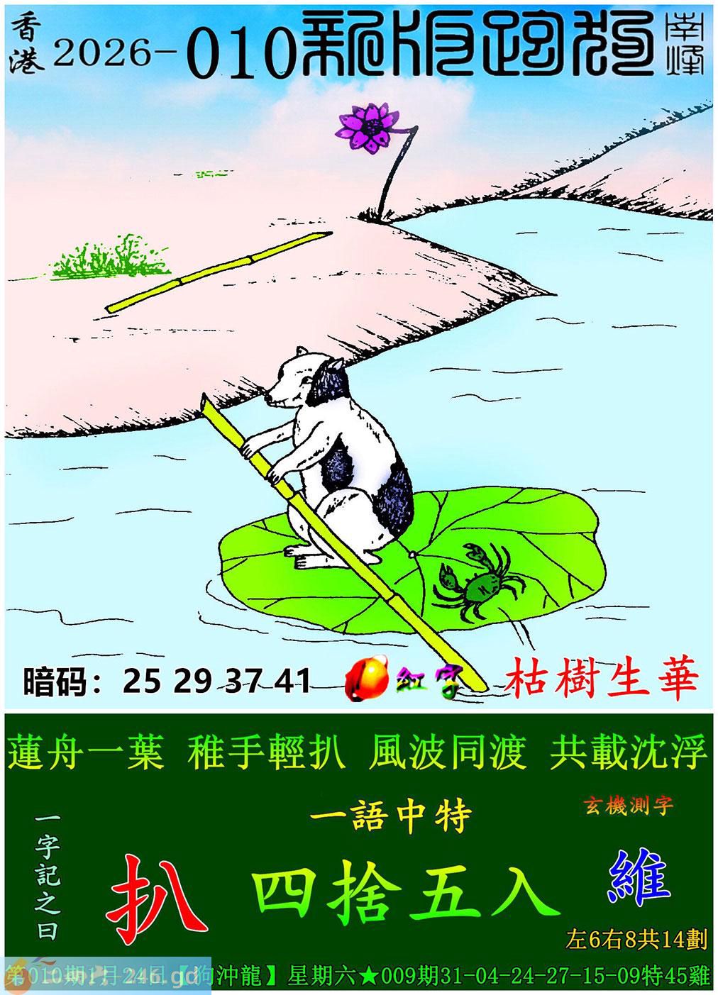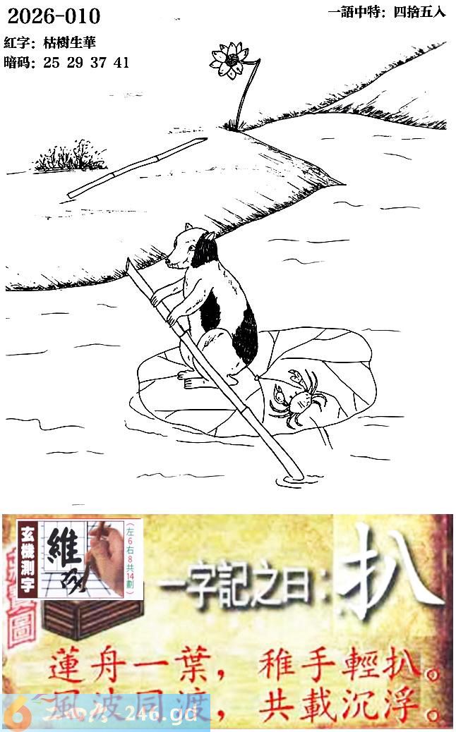 010期跑狗一字記之曰:【扒】 蓮舟一葉,稚手輕扒。 風波同渡,共載沈浮。 玄機測字:《維》 一語中特:四捨五入