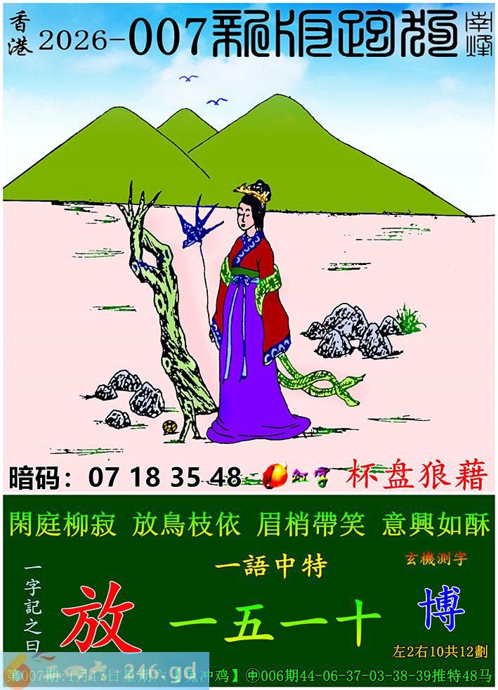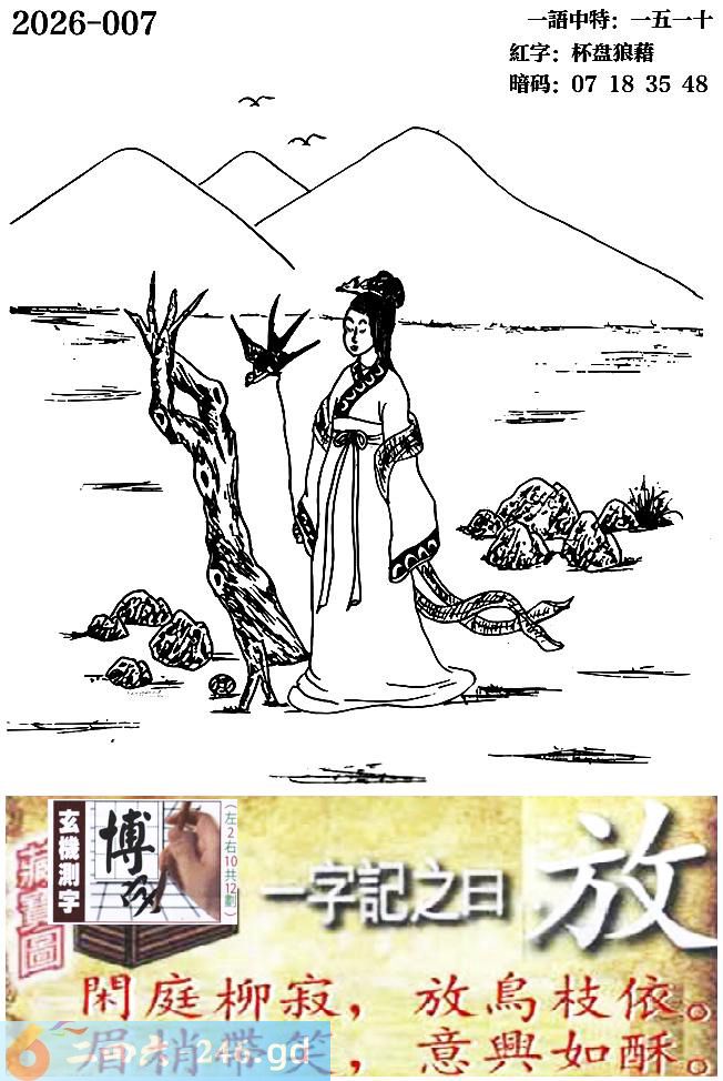 007期跑狗一字記之曰:【放】 閑庭柳寂,放鳥枝依。 眉梢帶笑,意興如酥。 玄機測字:《博》 一語中特:一五一十
